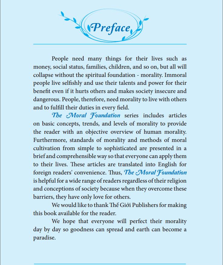 Vì vậy, bộ sách Nền Tảng Đạo Đức gồm các bài viết về khái niệm căn bản, khuynh hướng và mức độ đạo đức sẽ cung cấp cho độc giả cái nhìn tổng quát, khách quan về đạo đức con người. Đồng thời, các tiêu chuẩn đạo đức, phương pháp tu dưỡng… từ đơn giản, gần gũi đến phức tạp, tinh tế cũng được trình bày ngắn gọn, dễ hiểu giúp chúng ta có thể ứng dụng vào cuộc sống. Bên cạnh đó, các bài viết cũng được dịch sang tiếng Anh để độc giả ở nước ngoài cũng có thể dễ dàng tìm đọc và lĩnh hội trọn vẹn. Nền Tảng Đạo Đức hiện đang phát hành 5 tập, là một ấn phẩm đặc biệt dùng để dành nghiền ngẫm, học tiếng Anh… với những trang in màu đẹp mắt chắc chắn sẽ là món quà ý nghĩa dành cho tất cả mọi người. Luật Hoàng Nghiêm kính mời quý khách gần xa đón đọc những tập sách quý này.